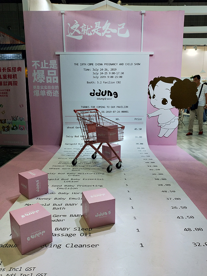 冬己展位結(jié)合卡通IP做出購物車和賬單的場景,巧妙地利用場地空間制造立體視覺,頗具想象力的設(shè)計(jì)實(shí)現(xiàn)有效地引流。